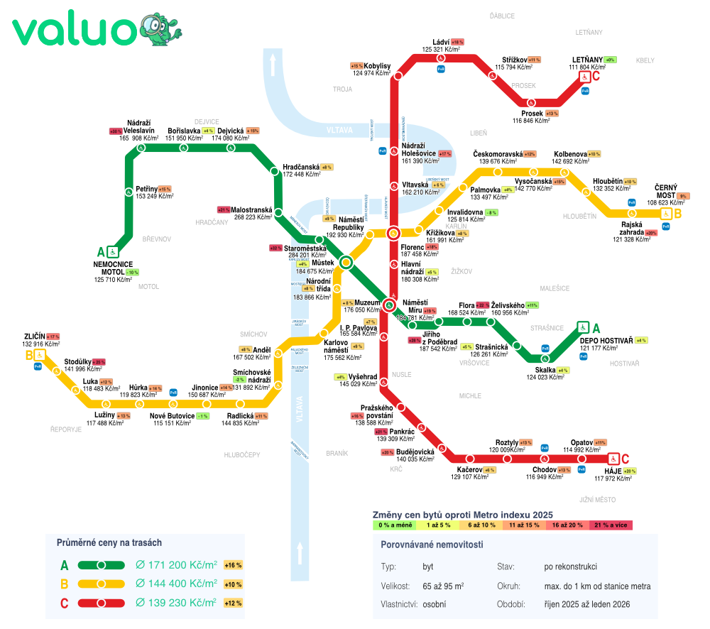Za tímto průměrem se však skrývá výrazná diferenciace. Zatímco některé lokality zaznamenaly růst přesahující 30 %, jinde došlo ke stagnaci nebo dočasné korekci. Trh u metra tak zůstává silný, ale jeho vývoj je stále více lokální.